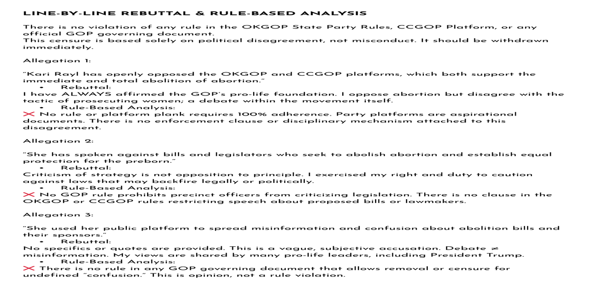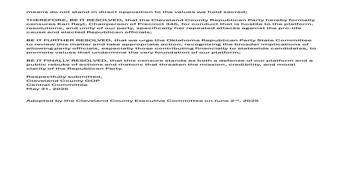 2 members of the Cleveland County GOP took it upon themselves to censure a Precinct Chair for refusing to be an Abolitionist. Kari Rayl states,"I am ProLife, both baby and mom. The Abolitionists are looking for ways for the government to take control of a woman's body when she becomes pregnant. This time they want to incarcerate females, all ages, all circumstances, for using the morning after pill to abortion and that is wrong"